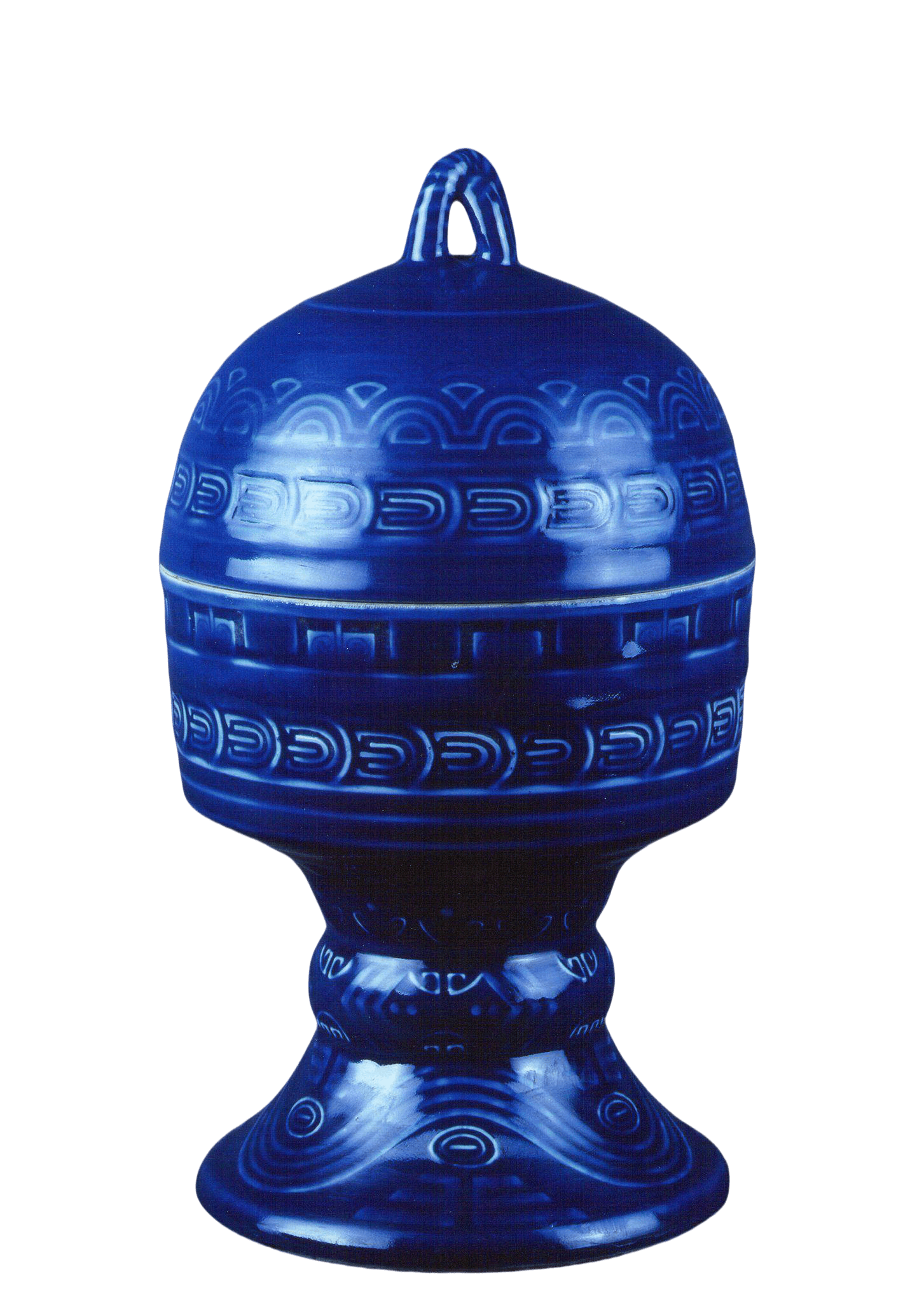 圆口平唇,器身直壁折腹,喇叭形高足中空。腹依次为垂云纹、回纹(乾隆仿古礼器改制时称谓,今将此回纹称做“重环纹”),校围波纹、金钣纹,足为波带黻纹。弧形盖,交叉绳纹纽,子口,面饰波纹、重环纹。器身外通施祭蓝釉。足底近边缘阴刻“大清光绪年制” 六字单行楷书款。 祭天礼器。圜丘坛正位、配位、从位,祈谷坛正位、配位及天神坛祭祀时陈设,每案1只。用以盛太羹。(摘自:《敬天尊祖礼乐备和天坛馆藏文物精品》)
