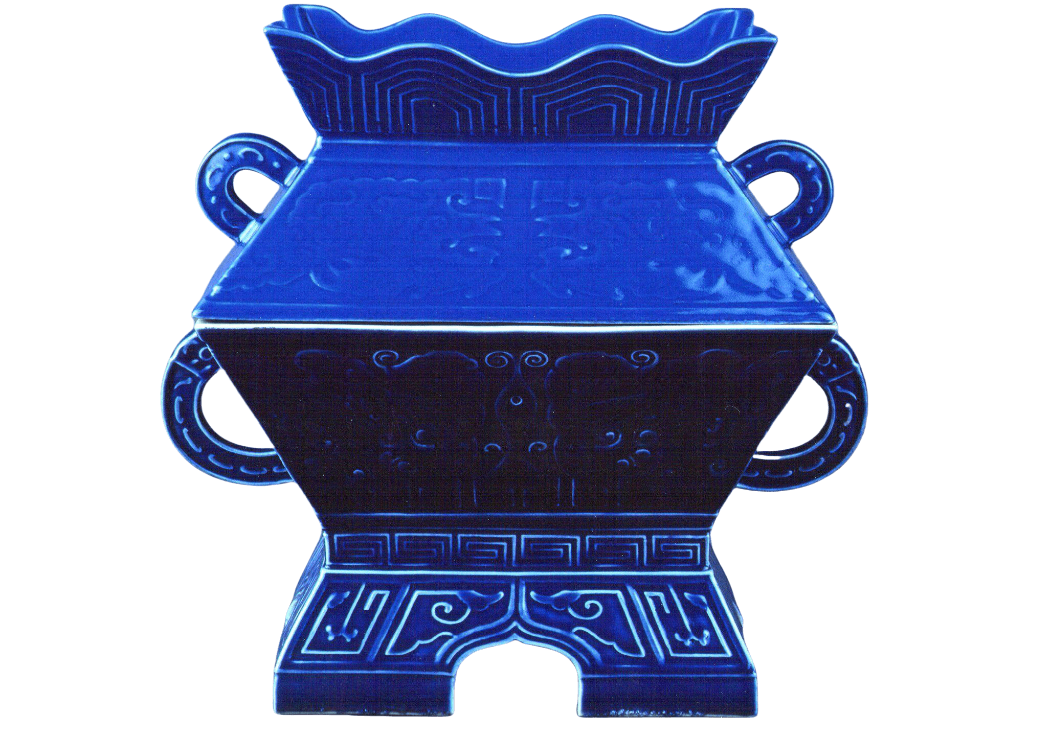 清光绪官窑款祭蓝釉刻花锦纹瓷铏